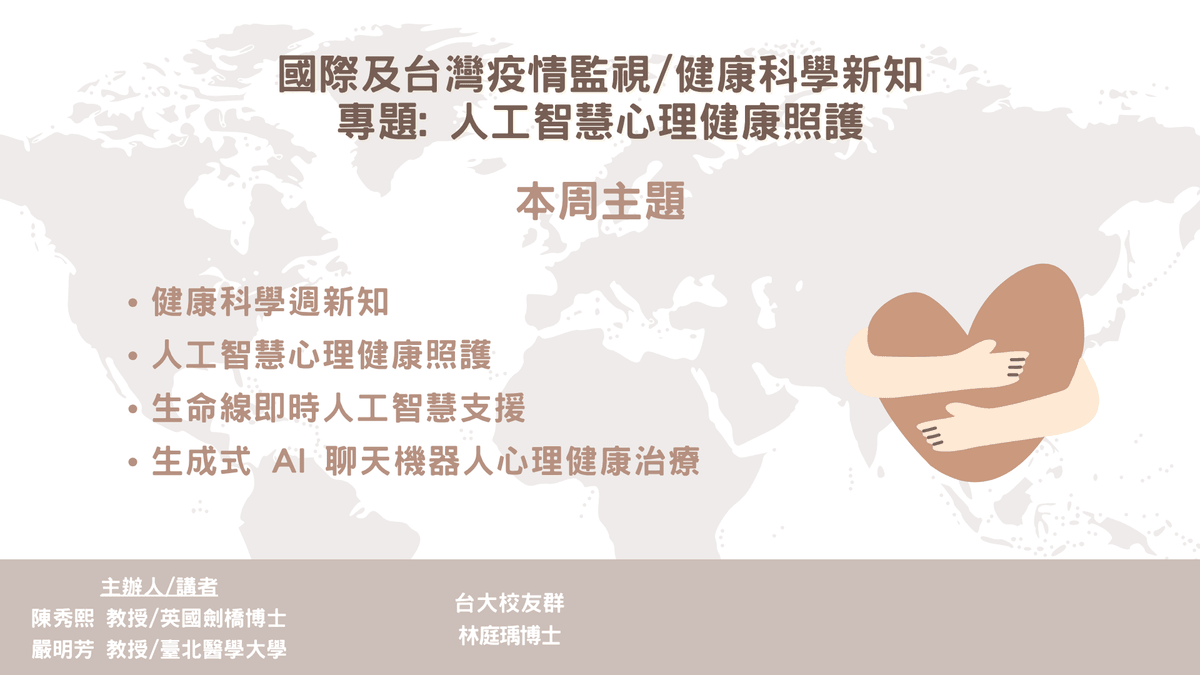 專題: 人工智慧心理健康照護本週健康智慧生活圈帶來四大面向健康科學新知,涵蓋傳染病防治、藥物治療新突破、癌症精準醫療,以及人工智慧生醫工程新進展,並以「人工智慧心理健康照護」作為本週深度專題,探討AI輔助自殺防治熱線與生成式AI聊天機器人心理健康治療的最新實證。傳染病防治方面,WHO發布三項新抗生素目標產品概況(TPPs),針對多重抗藥性革蘭氏陰性菌、嚴重革蘭氏陽性菌感染及細菌性腦膜炎三大優先領域,為全球新型抗菌藥物研發提供明確框架。英國腦膜炎群聚疫情持續,27例感染、2人死亡,歐洲自2021年起病例持續攀升,各國MenB疫苗政策不一成為防疫缺口。台灣本週爆發史上第3例蜱蟲傳播SFTS疫情,民眾於草地森林活動應做好防護。