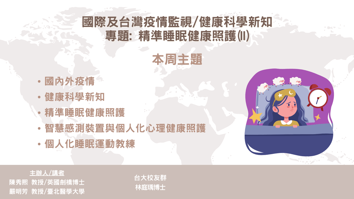 本週專題聚焦「精準睡眠健康照護(II)」,從臨床、行為與人工智慧三個層面探討失眠成因與介入策略。失眠並非單一症狀,而是生活作息失調、白天活動量不足與睡前心理壓力交互作用結果,長期失眠本身亦會成為新的健康風險,影響認知功能、情緒穩定與內分泌調節。單靠藥物治療難以解決問題,需結合生活調整與行為介入。隨著科技發展,穿戴式裝置可即時蒐集心率變異度、皮膚電反應與生化訊號,反映自律神經與壓力狀態;結合人工智慧分析後,可用於早期偵測心理壓力與情緒失衡。進一步透過個人健康大型語言模型(PH-LLM),整合專業知識、感測資料與主觀感受,提供個人化的睡眠與運動建議,協助民眾在日常生活中進行可執行健康調整運動及睡眠介入。