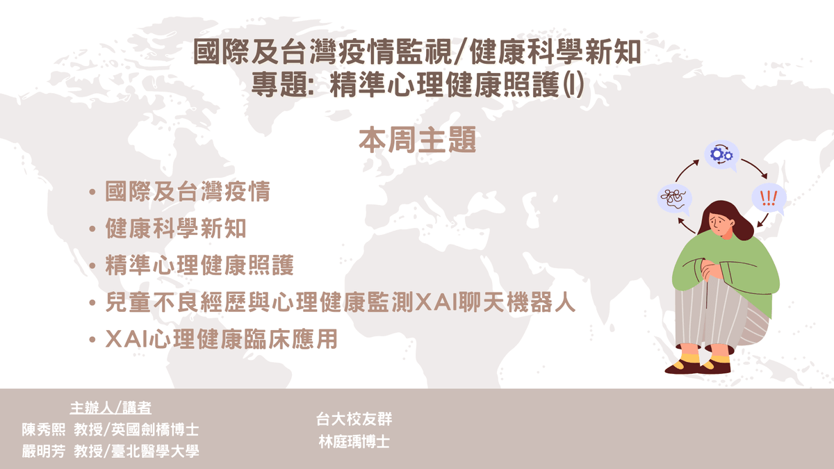 本週專題聚焦「精準心理健康照護」,探討心理健康如何從傳統診斷導向模式,邁向結合人工智慧個人化風險評估與介入。首先可解釋人工智慧(XAI)與大型語言模型(LLM)臨床應用,透過整合文字、語音與行為等多模態資料,將風險預測轉化為臨床可理解的自然語言說明。進一步結合情境感知對話系統與知識圖譜,模型可辨識兒童不良經歷與家庭風險因子,並連結醫療與社區資源,促進連續且可行的心理健康照護。再者,精準心理健康照護並非以AI 取代臨床判斷,而是透過可解釋人工智慧(XAI)與大型語言模型(LLM),協助醫療人員更清楚理解風險來源與情境脈絡,將心理健康介入前移至早期辨識與預防,提升臨床決策可行性與連續性。